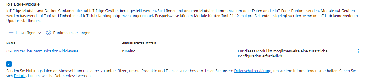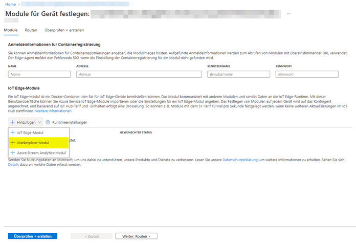 After setup, you can install OPC Router as a module. To do this, select the IoT Hub and click on "IoT Edge" in the navigation bar on the left under "Device Management." Select the appropriate device under the "IoT Edge Devices" tab.