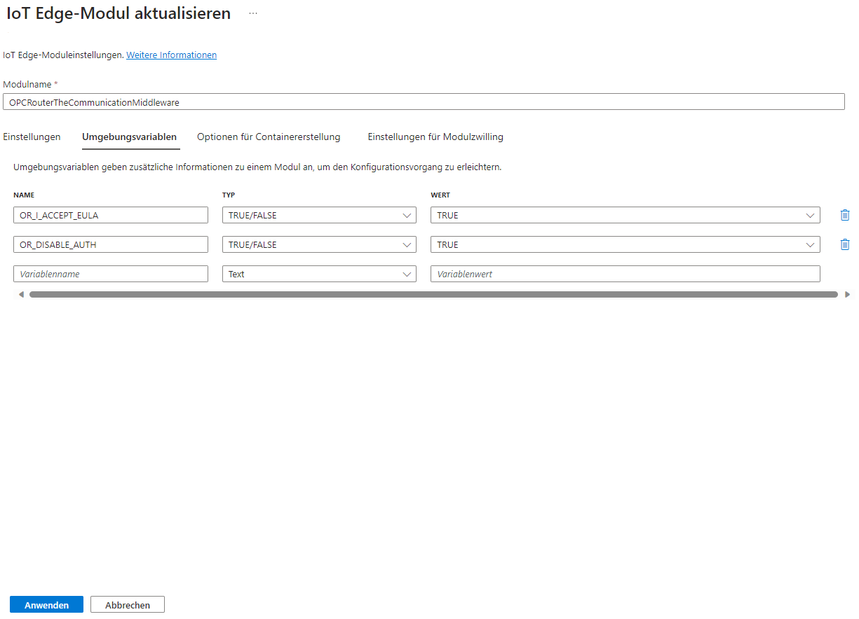 Go to the "Environment Variables" and enter "TRUE/FALSE" in the "Type" field of "OR_I_ACCEPT_EULA" "TRUE/FALSE" and "True" in the "Value" field if you agree to the EULA, and add the "OR_DISABLE_AUTH" variable in a similar manner. Click "Apply."