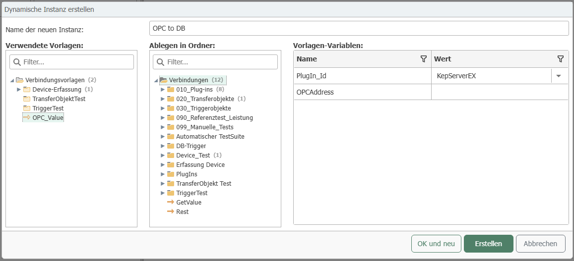Within this table, you will find the variables of the template as database fields, as well as the fields [ID], [OpcR_Changed] and [InstanceName]. To generate a new connection at runtime, you must fill in the fields for the variables in a row and assign a name ([InstanceName]) for the connection. If you do not specify a value for a variable, the default value previously selected in the "Create Instance" dialog will be used. A connection is now created for each row you fill in.