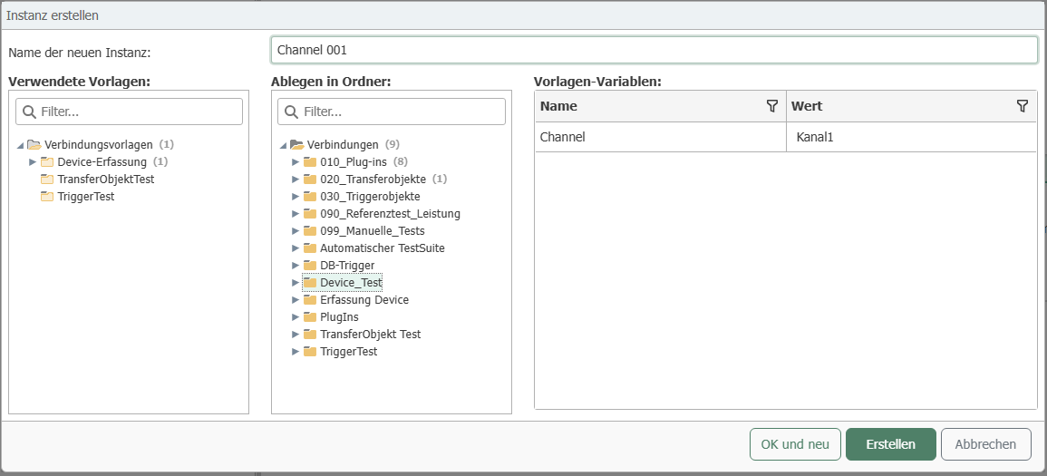 - You cannot change anything in the connection; you only need to specify the values for the variables. In this case, all you need to do is enter "1" under Number in the template variables. So enter "1" and close the connection by clicking "Create" or select "OK and New" to create additional instances.