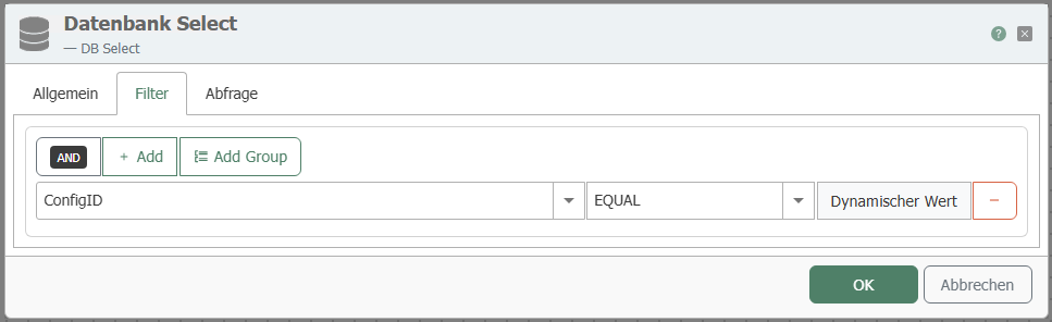 | Edit filter/filter group | Column: ConfigID Comparison operator: EQUAL |