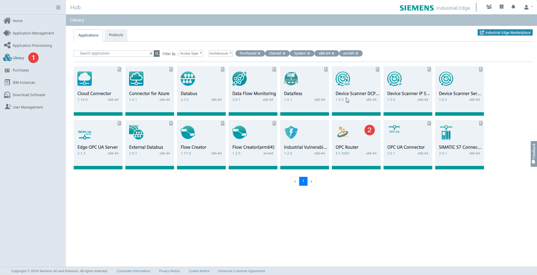 Navigate to the Library (1) in the Industrial Edge Hub and select OPC Router (2).