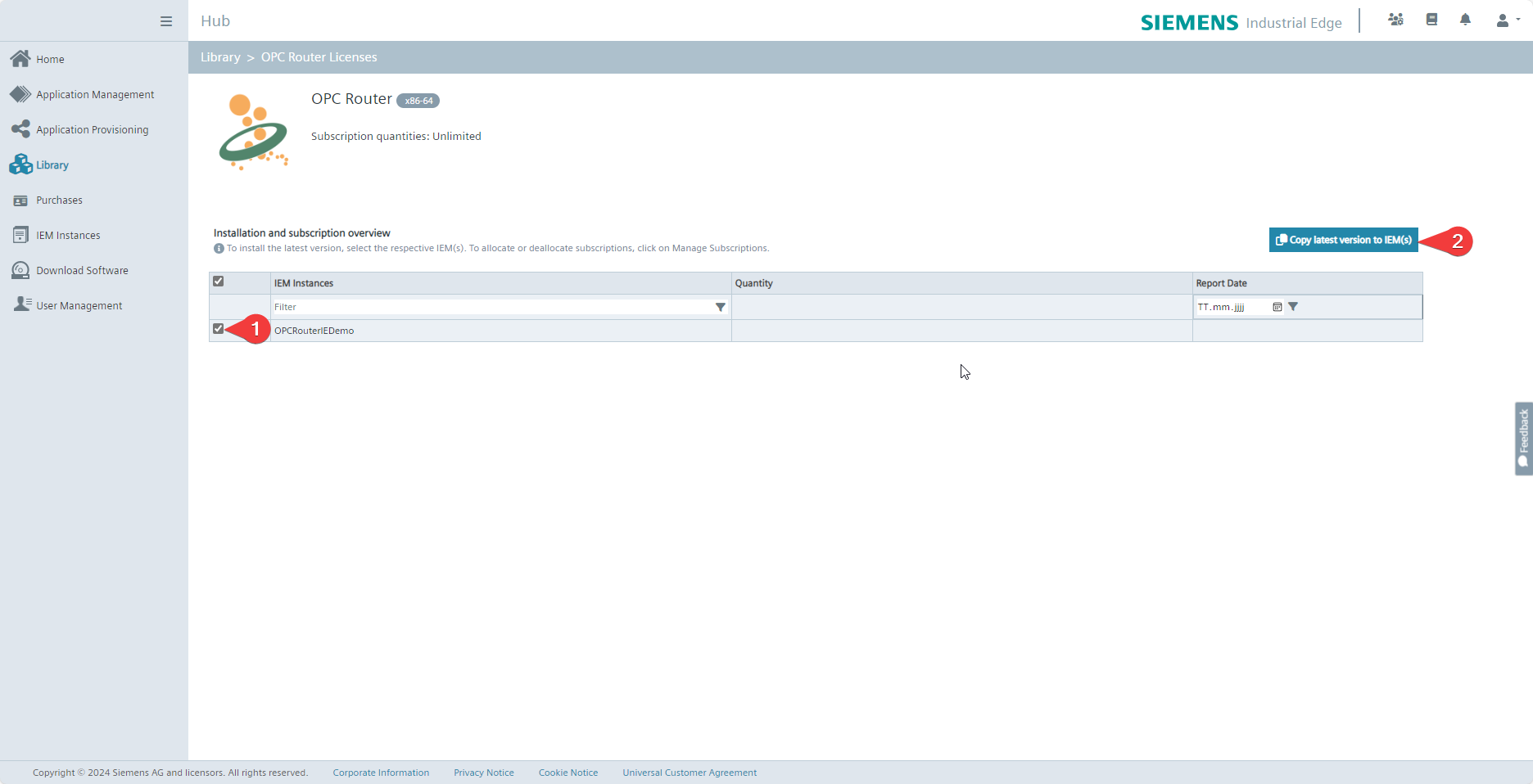 There, select the Siemens Industrial Edge Management instances (1) on which you want to make the OPC Router application available. By pressing Copy latest version to IEM(s) (2), the management instances are instructed to copy the OPC Router application from the Industrial Edge Hub. This process may take several minutes (15-30 minutes).