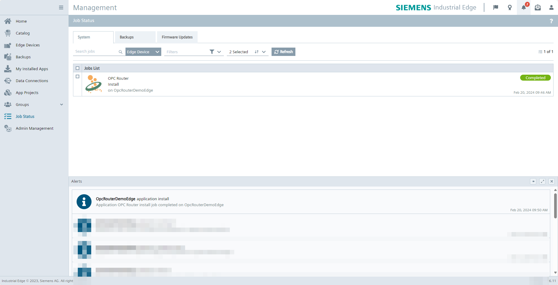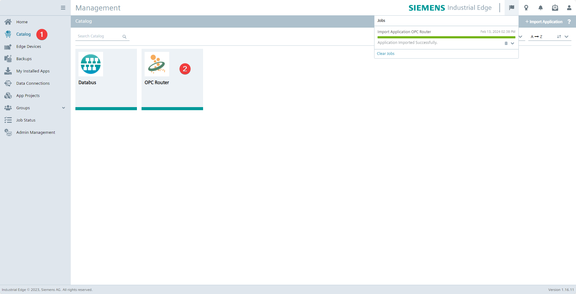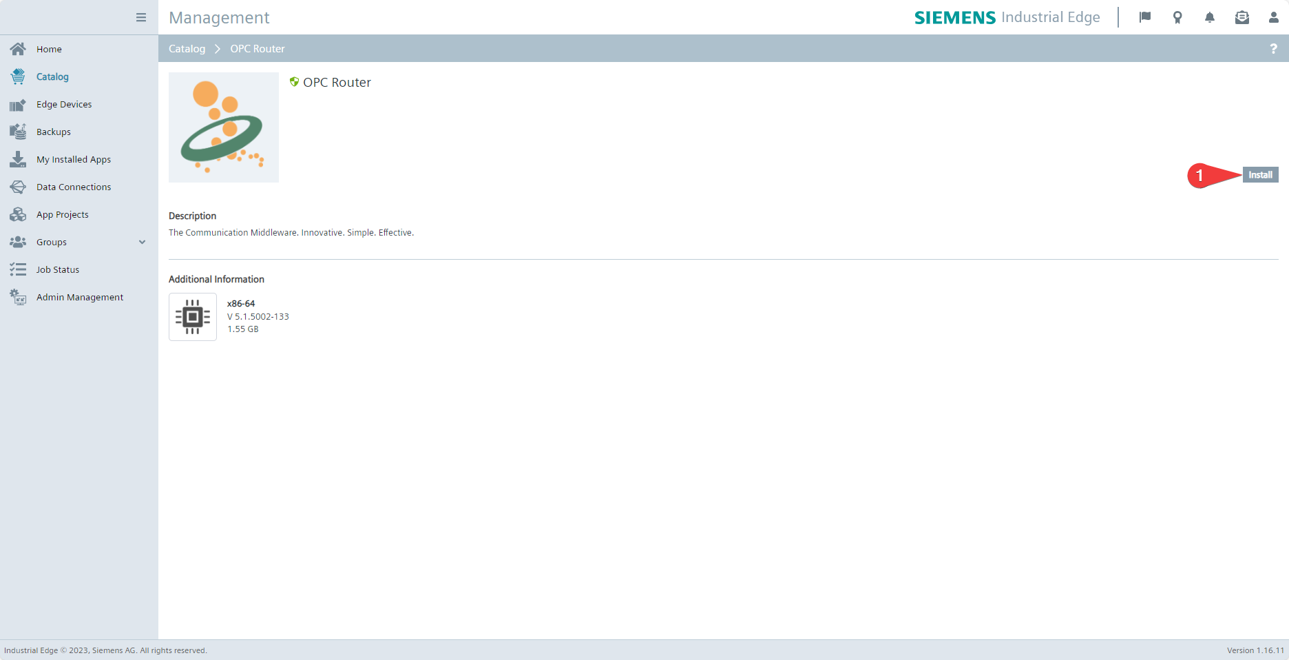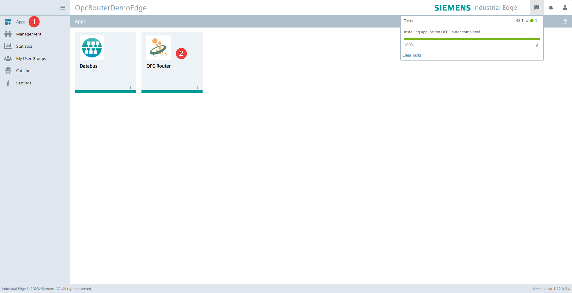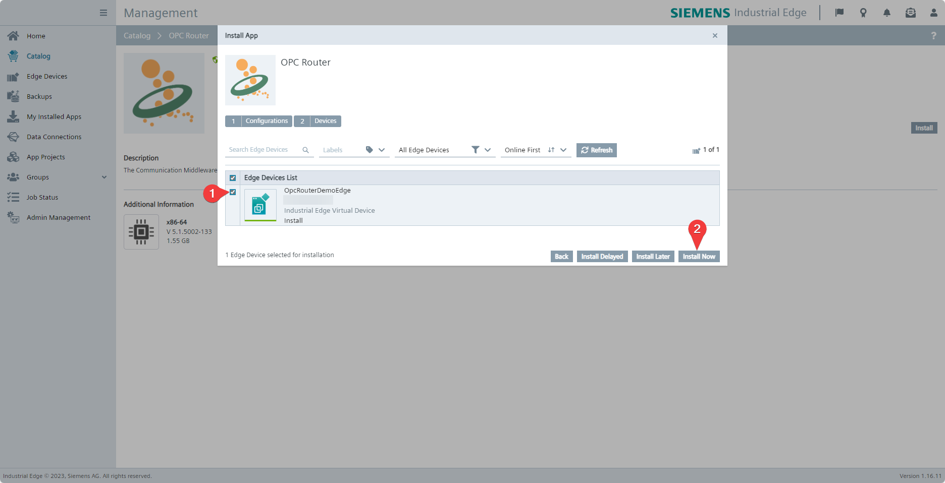 Switch to your Siemens Industrial Edge Management instance. Once the import process to your Industrial Edge Management instance is complete, you can find the OPC Router (2) under Catalog (1) and select it to install it on a device connected to the instance.