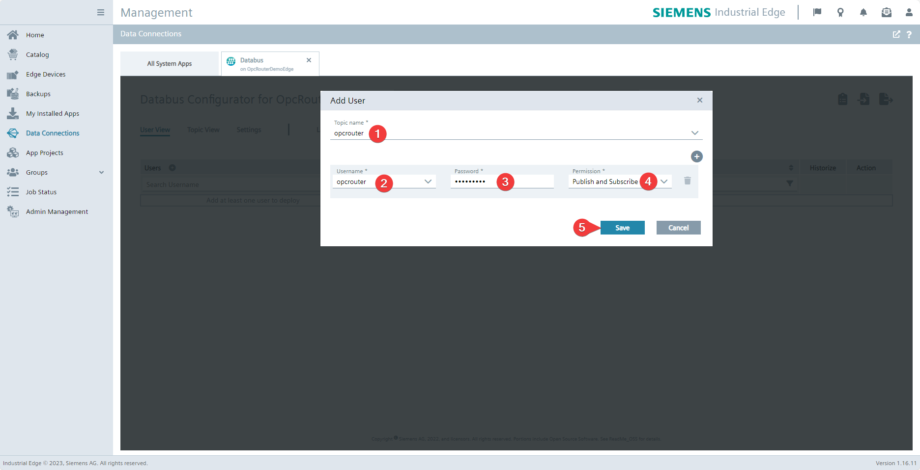 Enter the Topic name (1), Username (2), and Password (3). For demonstration purposes, opcrouter is used as the topic and username for the following examples. Select Publish and Subscribe (4) for the permission. Confirm your entries by clicking Save (5).