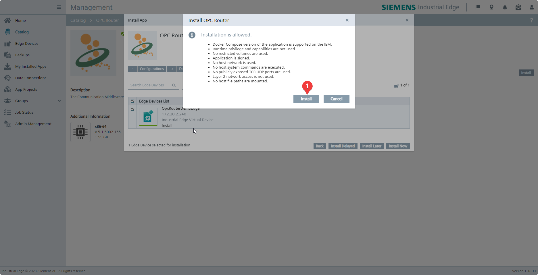 Click Install (1) to install the OPC Router on a device.