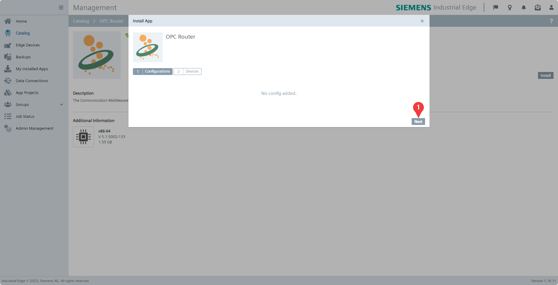 The OPC Router application for Siemens Industrial Edge does not have any alternative configurations, so click Next (1).