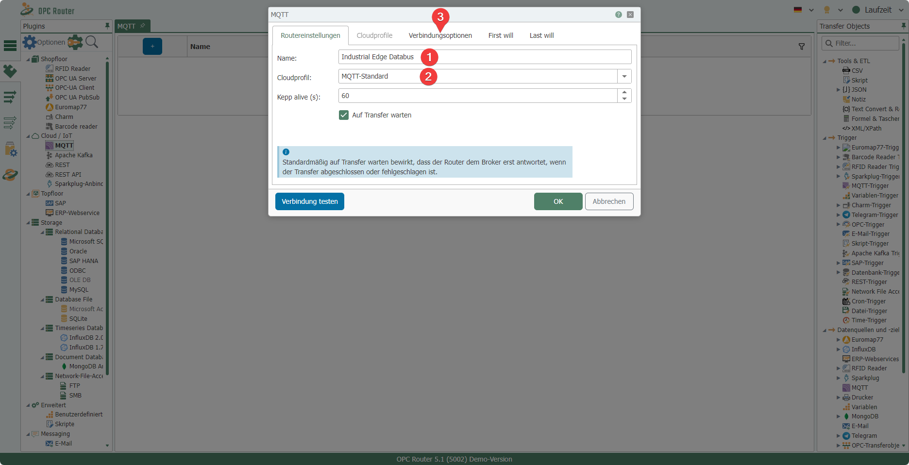 Give the instance a name of your choice (1) and make sure that MQTT Standard (2) is selected as the cloud profile. Then navigate to the Connection Options (3) tab.