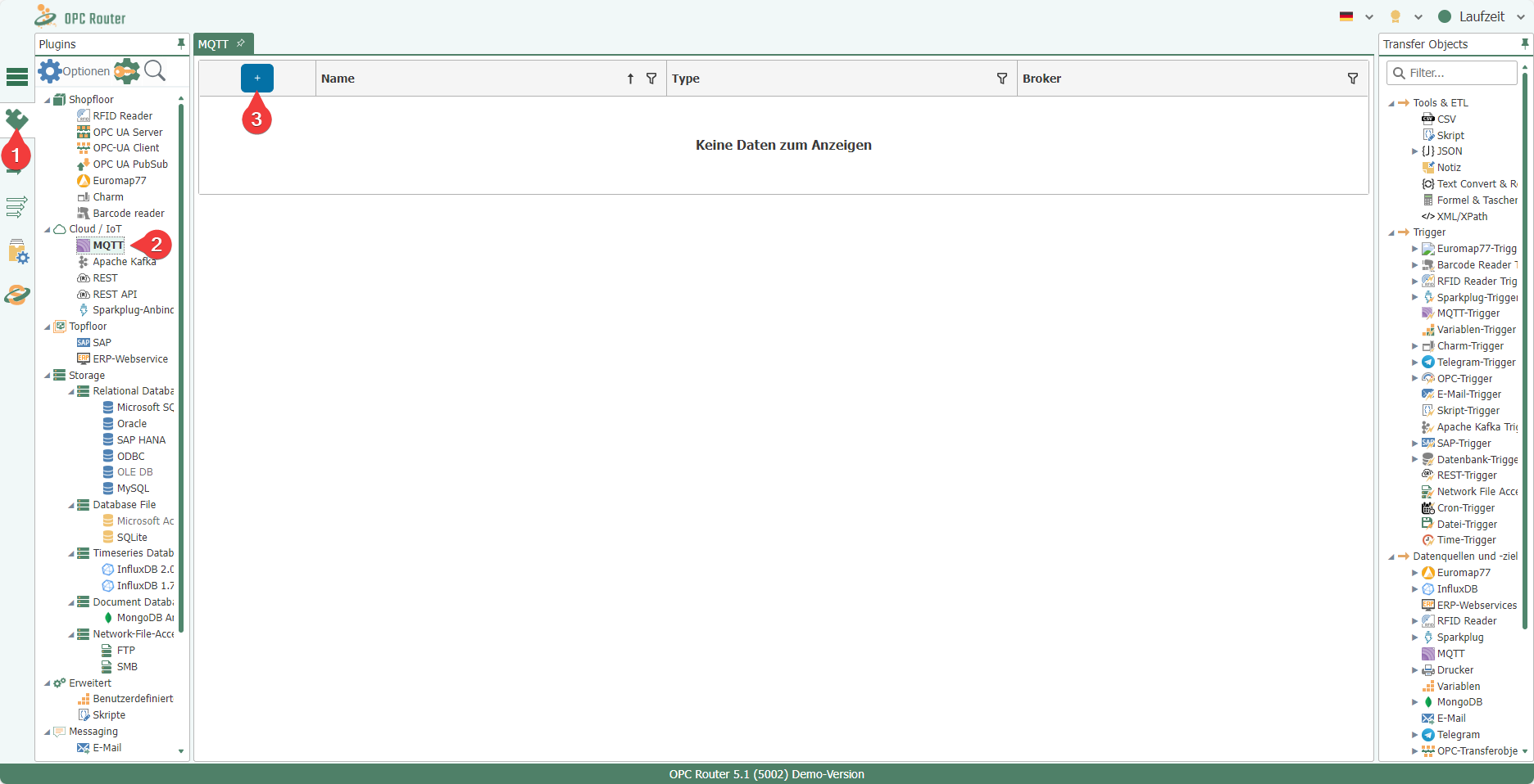 In the OPC Router Management of the device, select the MQTT plug-in (2) under the Plug-ins (1) menu item and create a new instance of this plug-in (3).