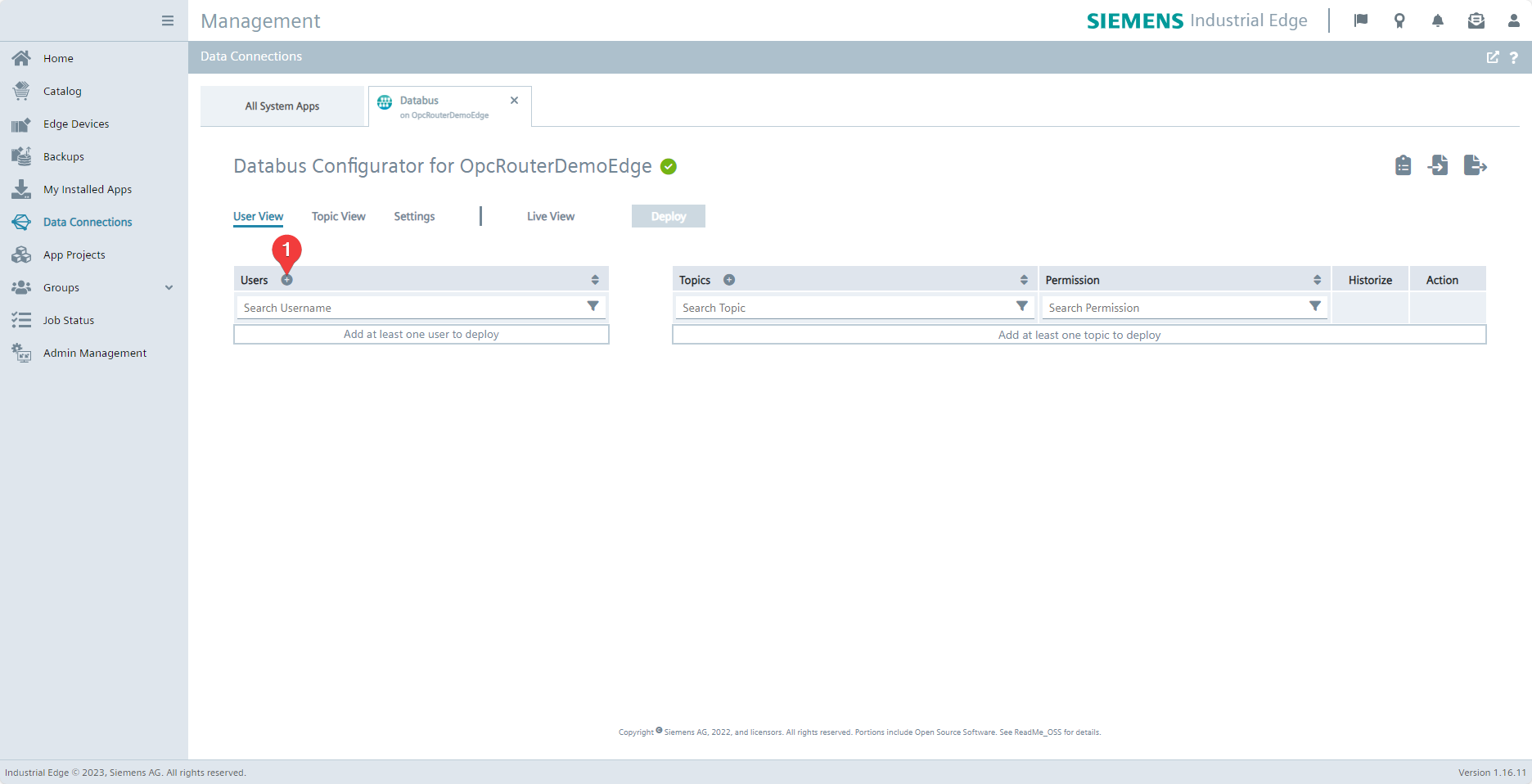 This chapter can be skipped if the Databus already has a topic and associated users with publish and subscribe permissions to which the OPC Router can be connected.