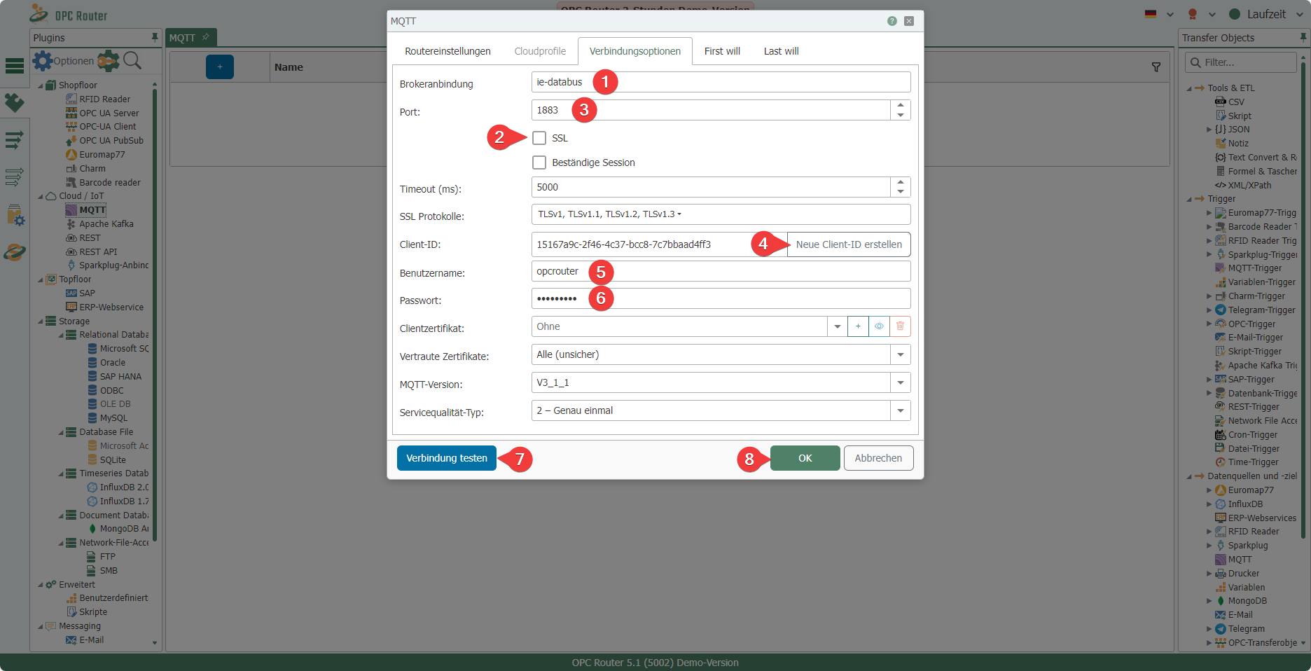 Enter ie-databus (1) as the broker connection and disable SSL (2). This should automatically set the correct port 1883 (3) – make sure that this is the case. Create a new client ID by clicking Create new client ID (4) and enter Username (5) and Password (6). If the connection test (7) is successful, confirm your entries by clicking OK (8), otherwise check your entries for deviations from the settings selected above.