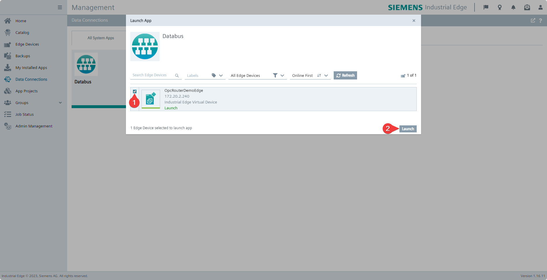 Select the device (1) on which the OPC Router is located and click Launch (2) to start the configurator for the Industrial Edge Databus.