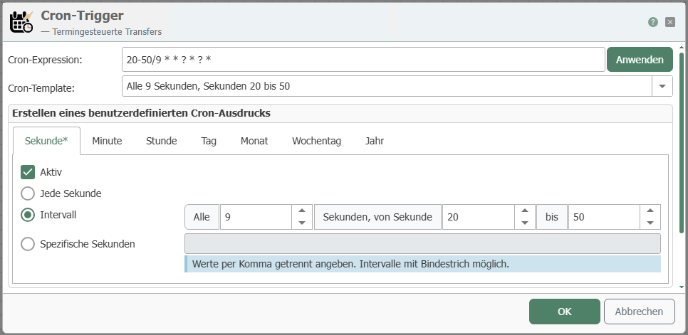 | Active | After selecting a range (second, minute, hour, day, month, weekday, year), activate the checkbox to activate the trigger. The areas that are activated are indicated in the tab by an asterisk *. You can define specific details by simply entering a number. For example, if 5 is entered for Specific hours, the transfer will only be triggered at 5 o'clock. Multiple specific entries can be separated by commas. |
