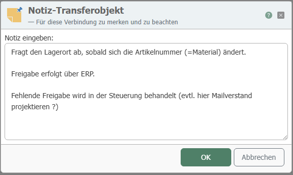 Use the "Note" object to add one or more detailed comments to a connection, e.g., documentation on project planning. To view or edit the note, double-click on your note transfer object. This allows you to clearly organize even extensive comments.