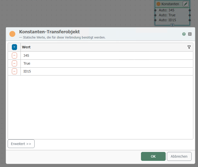 "Constants" are available as a data source for quick project planning of static values. Unlike variables, constant objects are only valid within the connection in which they are planned. Constant objects can only be defined at design time, but cannot be changed at runtime.