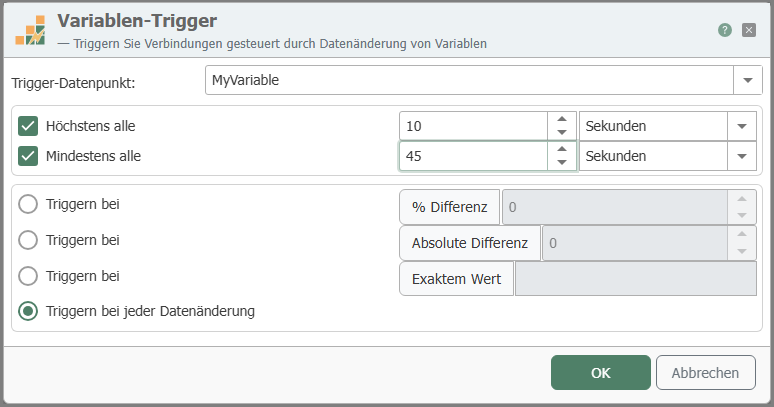 Trigger at ... % differenceThe transfer is only triggered if the value of the data point changes by this entry (relative).