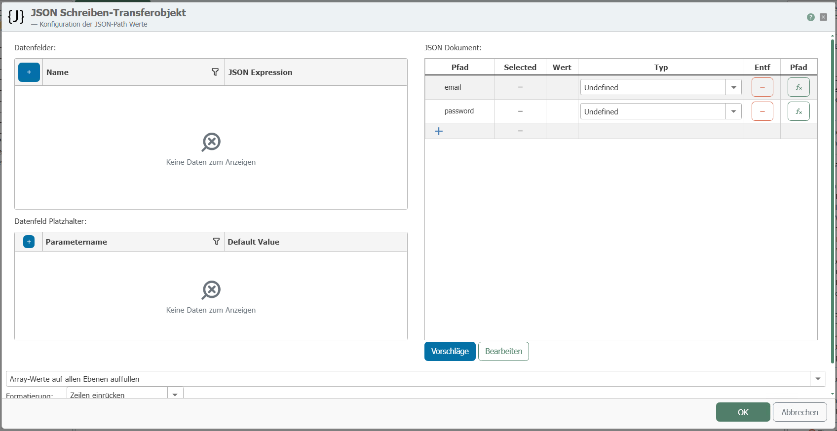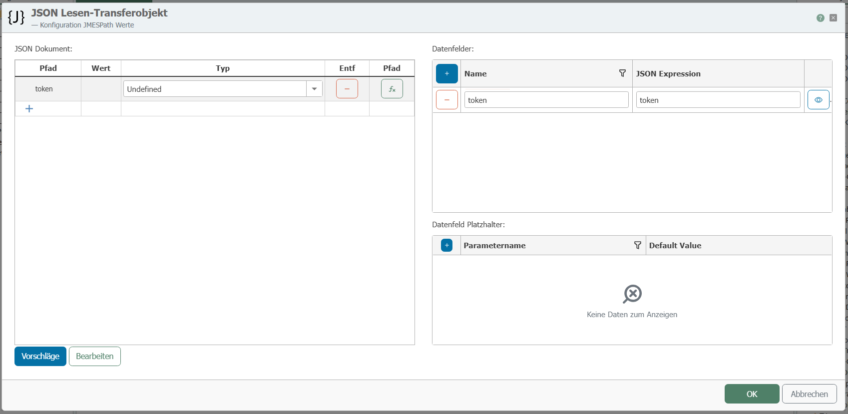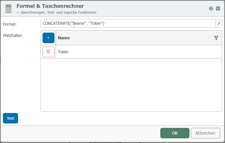 Drag the variable to the token parameter of the JSON transfer object. Create a calculator transfer object and select the CONCATENATE function using the "More" button. Create a placeholder using the "New" button. Enter the following parameters into the function as shown in the screenshot.