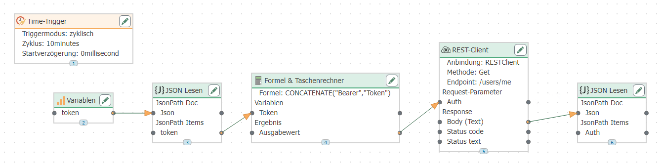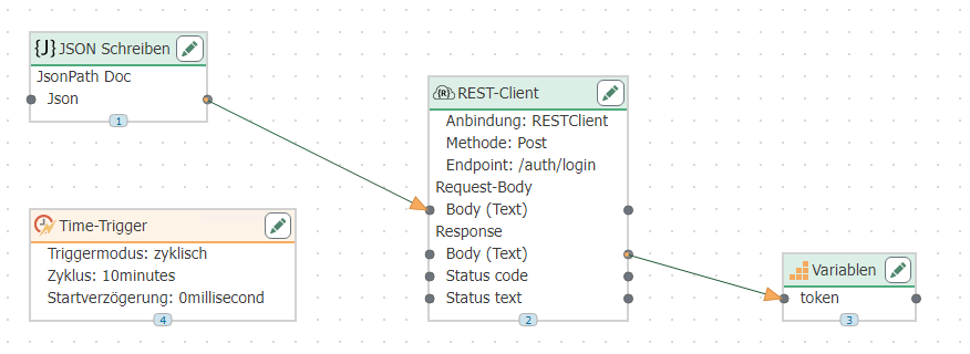 Create a variable with the name token, which is untyped. Connect the Body parameter in the response to the variable. To execute the connection cyclically, integrate a time trigger and set the desired cycle.