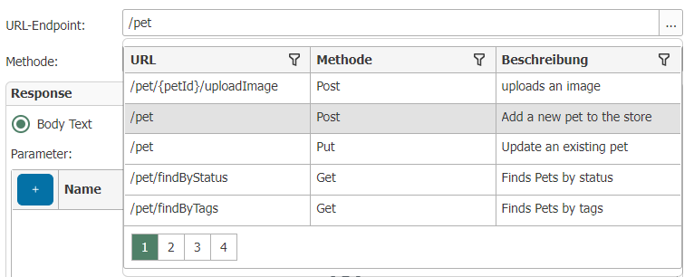 | URL endpoint | Address for the endpoint. If an OpenAPI file has been specified for the selected connection, the endpoint can be selected from a dropdown menu (see graphic). Placeholders can be defined within the URL in curly brackets. E.g.: |