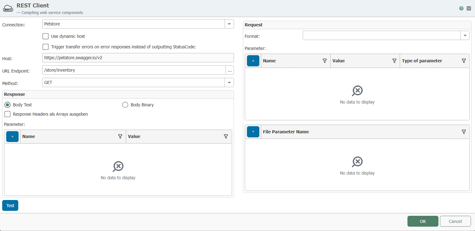 | Test | The "Test" button opens a modal window where you can check whether the connection is working correctly. You can try out the call using the "Send" button. If the call works, the expected response (response body) is displayed and the response parameters are assigned corresponding values. |