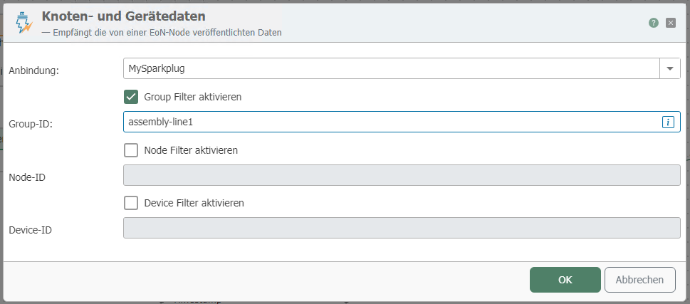 The Sparkplug node and device data changed trigger initiates a connection as soon as a connected device changes its data. Specific devices can be connected using filters.