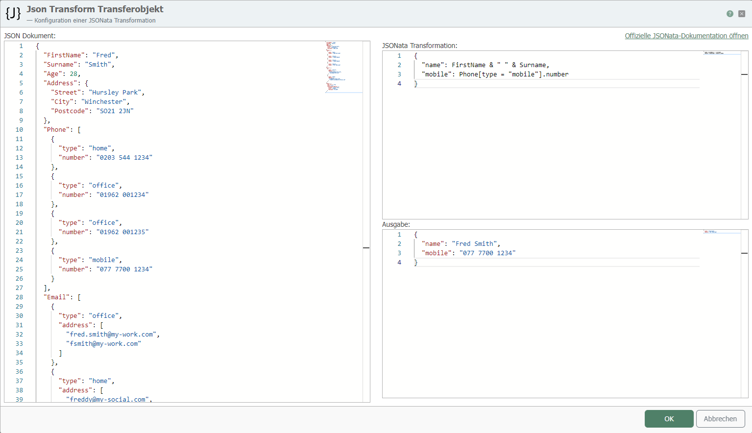 JSON documentThe input document in JSON format to which queries and transformations are applied is transferred at runtime. If no documents are transferred, the document configured here is used.
