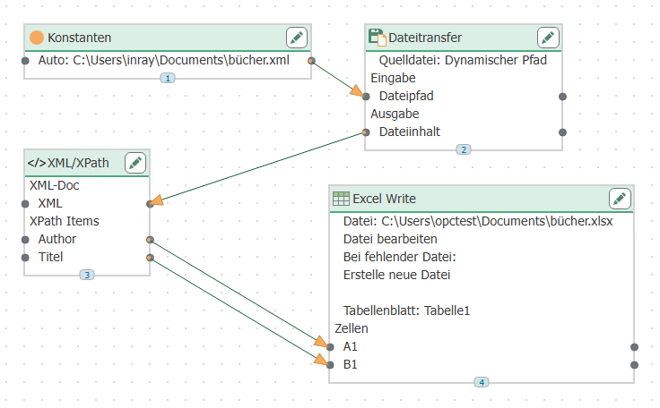 1. The path and name of the file are transferred from a constant object to the file transfer object. The name could also be determined dynamically from a database. 2. The file transfer object transfers the content of the XML file to the XML element in the XML object. At design time, no code was stored here, only the two X-Path expressions described. 3. The query results are written to an Excel file. Any other destination (e.g., database INSERTS) is also possible. Since multiple lines are expected, the write mode in the Excel object is set to "Append lines."