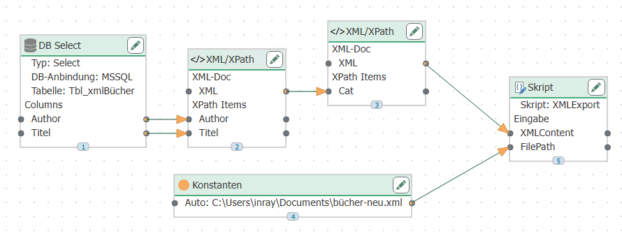 With the X-Path query /catalog and the XML output property "Combine in one document" 4. The code can be transferred further. Here, a script transfer object is used to create a file. The file path (type: string) and XML content (type: array, string) are transferred as input parameters: