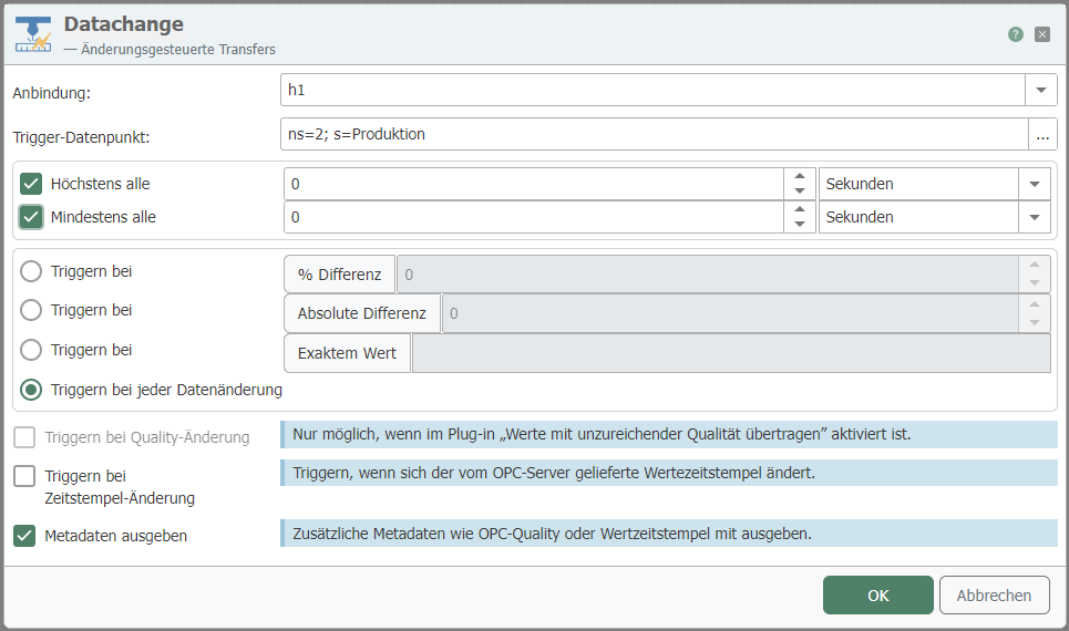 If the value of the data point changes frequently, the transfer rate can be limited here via an interval. The entry therefore means: "The maximum transfer rate is, for example, once per second, even if the value changes more frequently."
