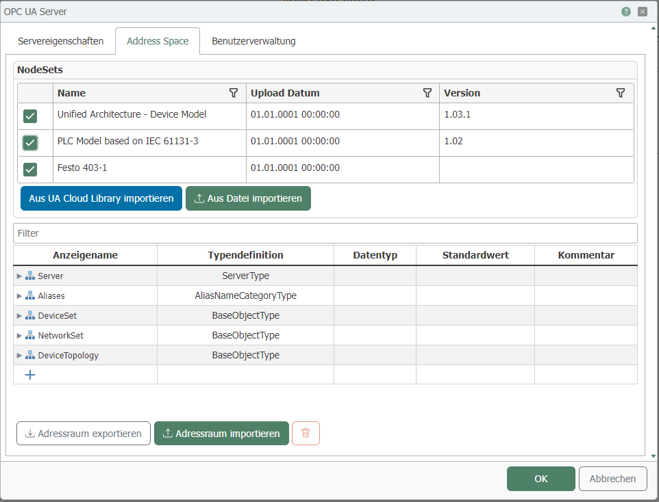 You can find the Node Sets in the OPC UA Server on the Address Space tab.