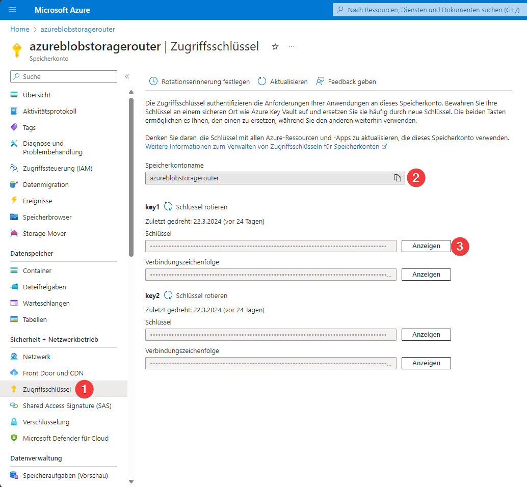 - Account Key: To connect with the account key, you must specify the name of your storage account and the key. You can find the key in the Azure Portal under 'Access Keys' (step 1). The name can be found in step 2 and the key in step 3. Copy this and paste it into the OPC Router. The following image shows where to find the information.