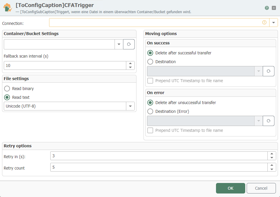The Cloud File Access trigger initiates a transfer as soon as a file is added or modified in a container/bucket in the cloud.