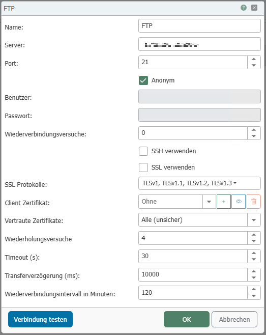 | Retry attempts | If connection problems occur, the transfer is repeated the specified number of times before an error is returned. |