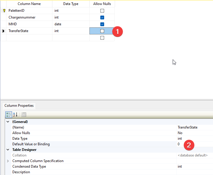 1. Add an additional column "TransferState" to your table and set the default value to 0 (2) without allowing zero values. (1)\