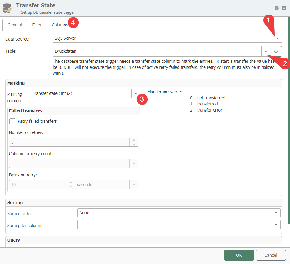 1. Add the Transfer State Trigger to your OPC Router connection and double-click to open it for editing. Select your database (1) and your table (2). Then select the "TransferState" column you just created to highlight it (3) and switch to the "Columns" tab (4).