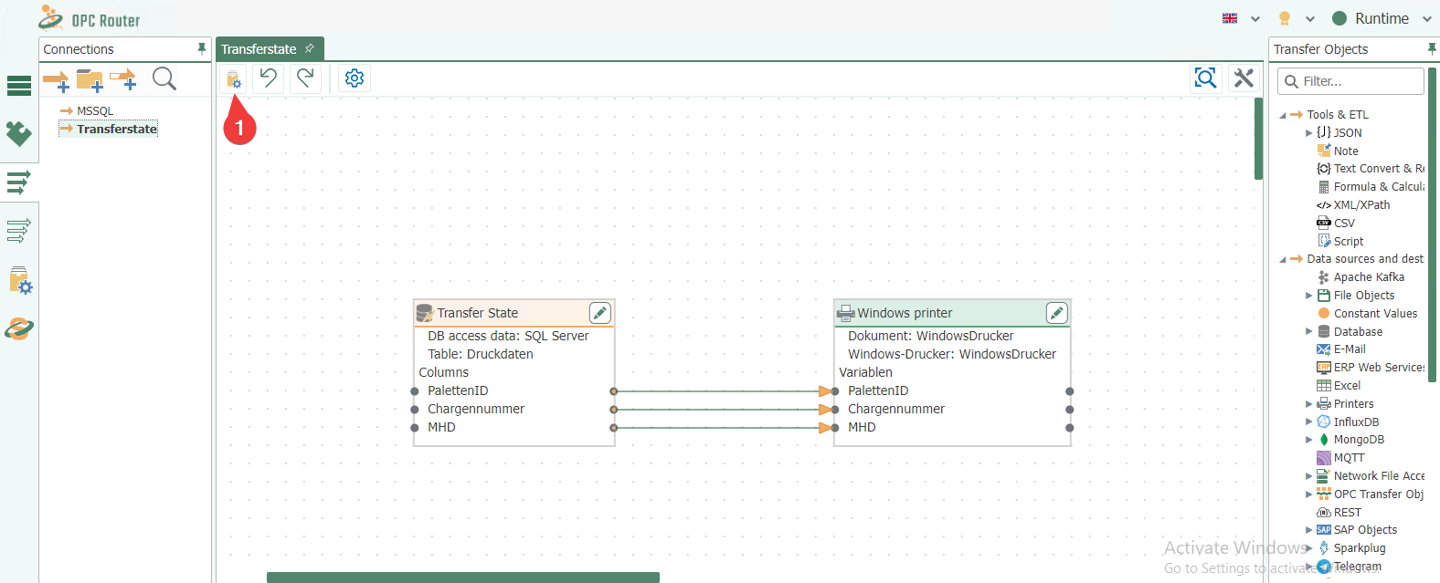With the Select Transfer Object and the Transfer State Trigger, the OPC Router supports the option of repetition in case of error, for example, if the target system is not available. To do this, use an additional column to record the number of errors. This automatically aborts the transfer when an error threshold is exceeded and marks the data set as finally faulty. In addition, a time delay can be set for repetition in case of error.
