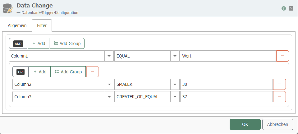 The Data Change Trigger monitors query results and triggers a transfer when changes occur. To do this, a select query is defined in the Data Change Trigger. The columns to be monitored are specified in the "General" tab. The "Filter" tab can be used to define more precisely when a transfer should be triggered. For example, a transfer should only be triggered when a column has a specific value.