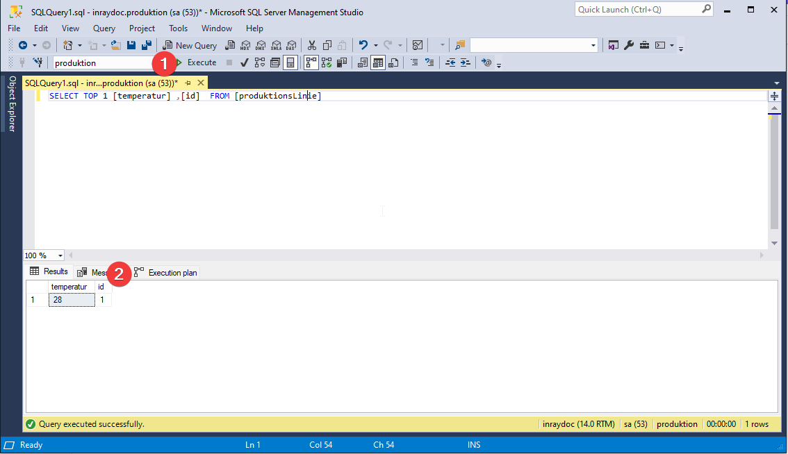 After execution (1.), another tab, "Execution Plan" (2), appears at the bottom.