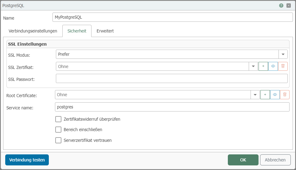 • VerifyFull: The connection fails if the server does not support SSL. Also checks the server certificate with the host name.