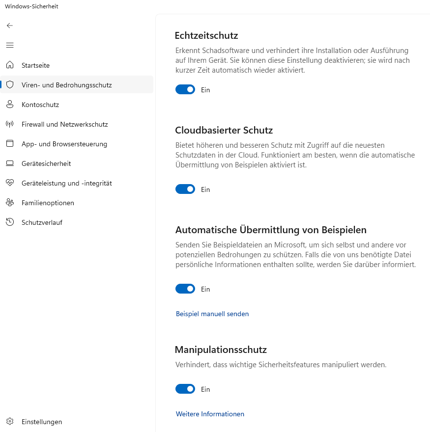 To do this, open the "Windows Security" application. In the "Virus & threat protection" section, click on the "Manage settings" button located under "Virus & threat protection settings". Here you can disable the relevant functions.