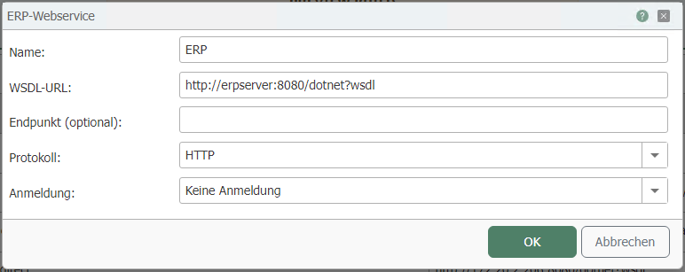 If you need to log in to the web service, select the desired type here. You can obtain the relevant information from the administrator of the web service/ERP system. Depending on this property, you can configure additional settings: