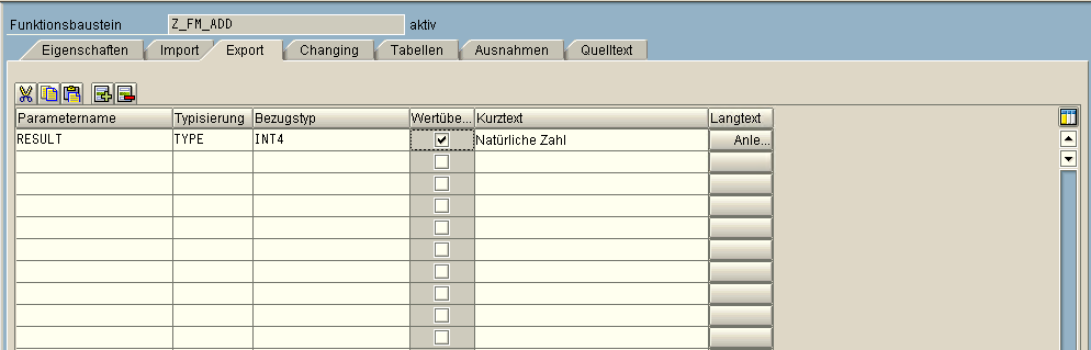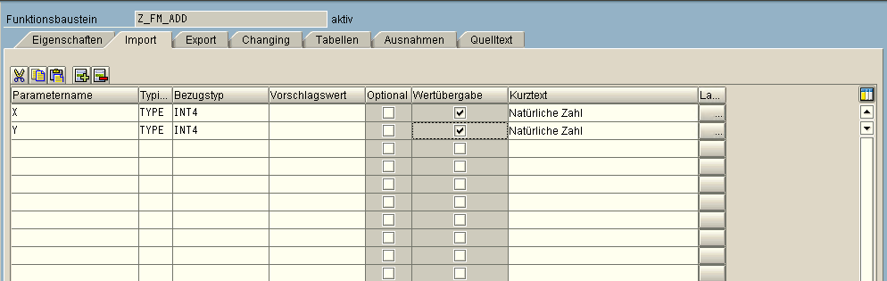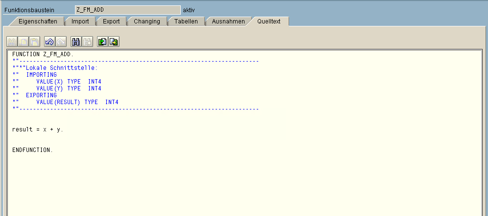 For example, we have a function module named Z_FM_ADD, whose import, export, and source code are shown in the following figure.