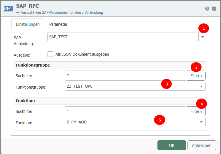In this example, the module function Z_FM_ADD is located in the function group ZZ_TEST_OPC, and a connection named SAP_TEST has been created in the SAP plugin to access it.