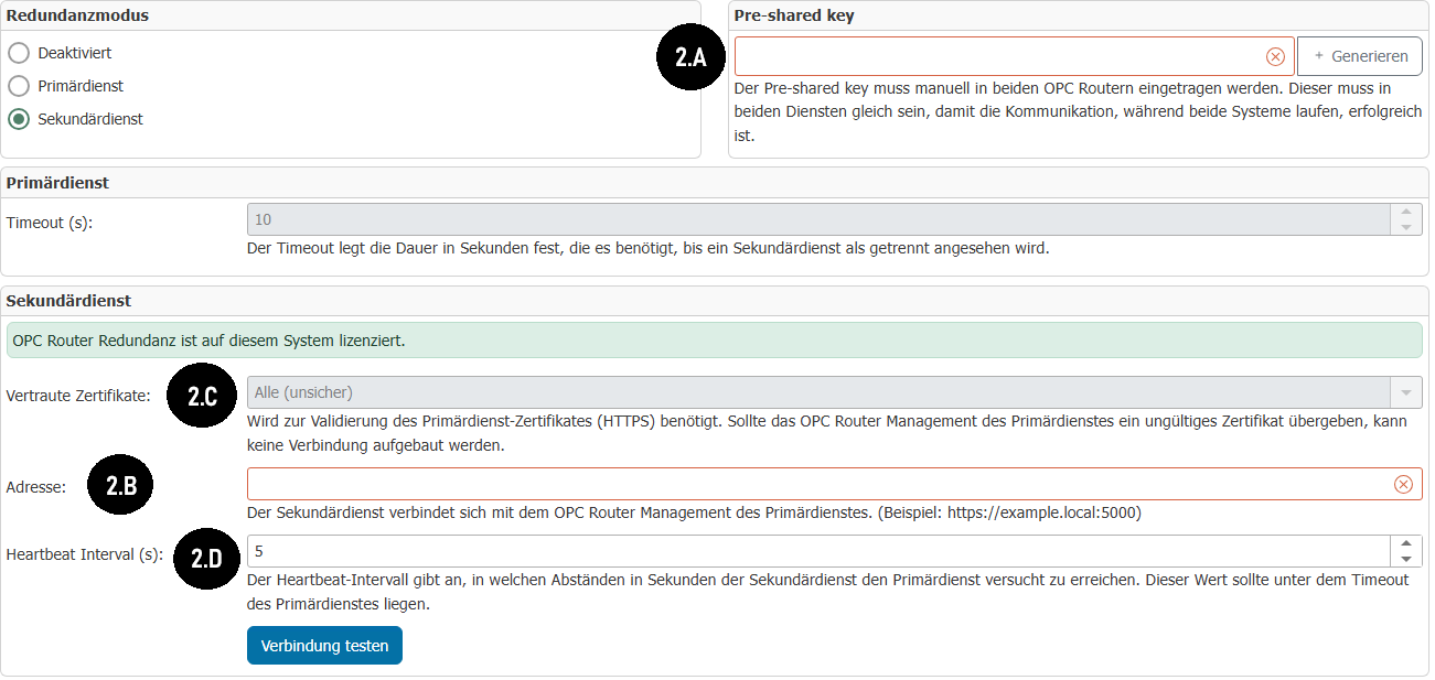In legacy redundancy, you had to fill in the "Primary Hostname" and "Primary Port." In Secure Redundancy, you can specify the address of the primary service directly (2.B).