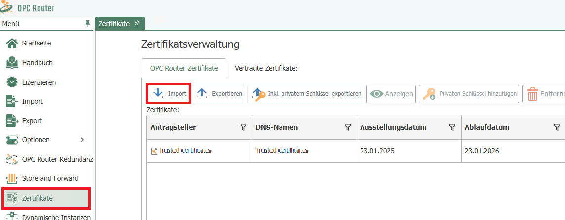 Go to the menu, then Certificate Management, and import the self-signed SSL certificate you generated to use HTTPS with OPC Router.