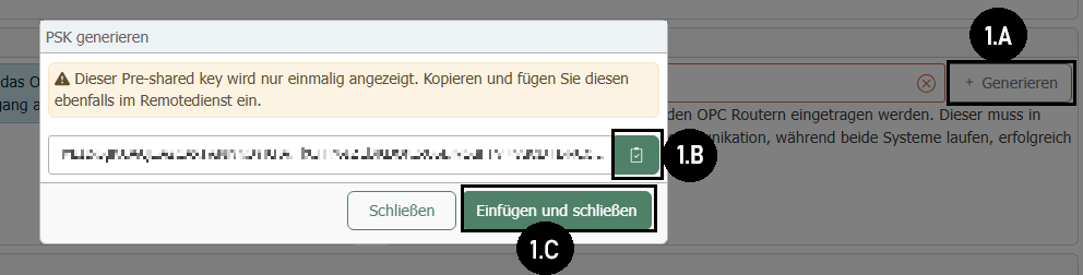 The "Pre-shared key" must be generated (1.A). Remember to copy the key to your clipboard (1.B) before clicking Paste and Close (1.C).