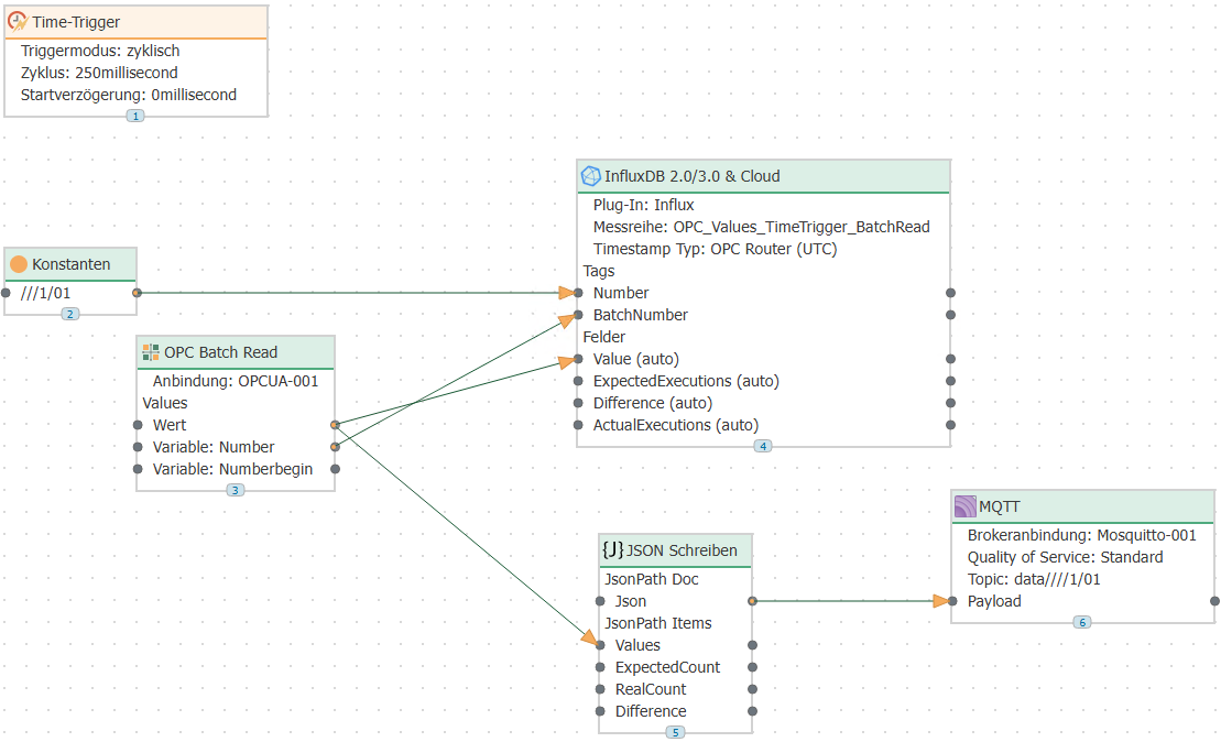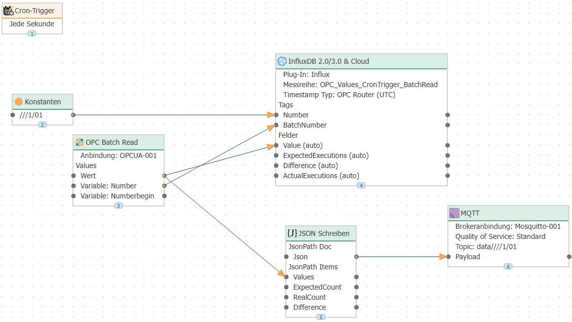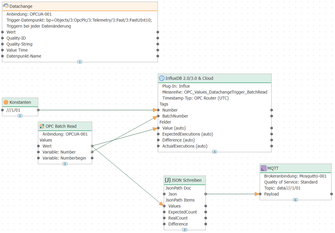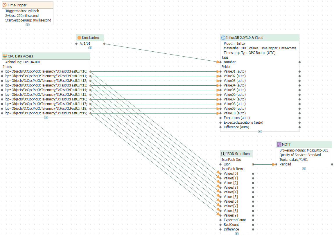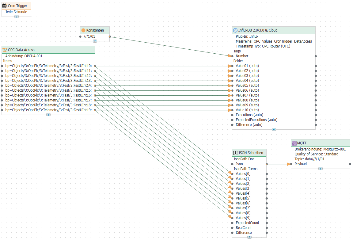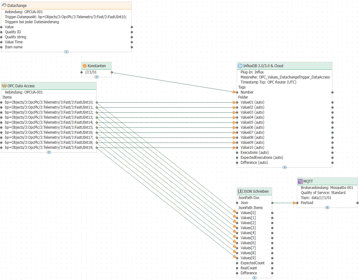 Ten data points were read in each connection using a batch read transfer object or a data access transfer object. The data is sent to MQTT and also written to an Influx database.