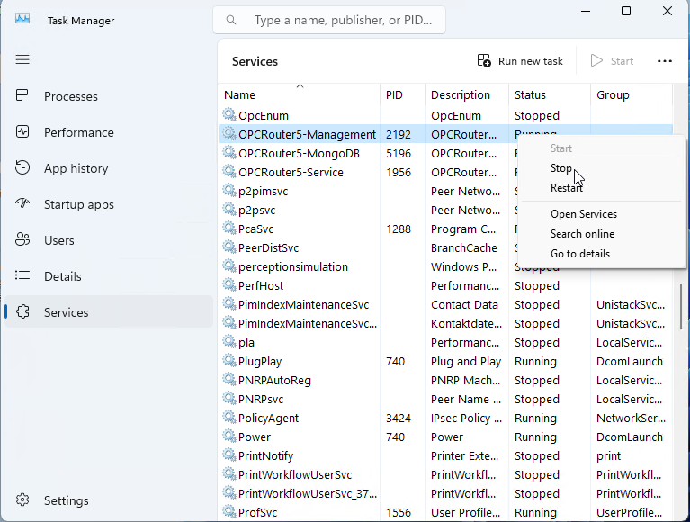 First, stop the Windows services OPCRouter5-Service and OPCRouter5-Management in that order, either through the Windows Services interface or via Task Manager.