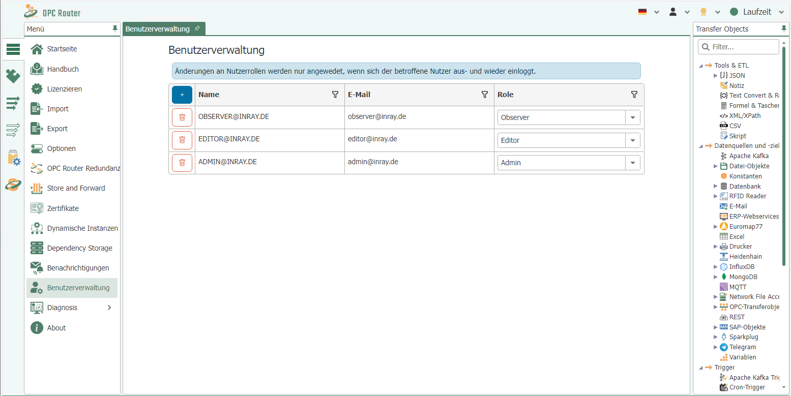 - Windows User Integration: For seamless integration into existing Windows environments, the OPC Router supports login with Windows user accounts. This allows users to authenticate using their existing Windows credentials without having to manage separate login credentials for the OPC Router. This option facilitates simple and efficient use in organizations with a Windows-based IT infrastructure.